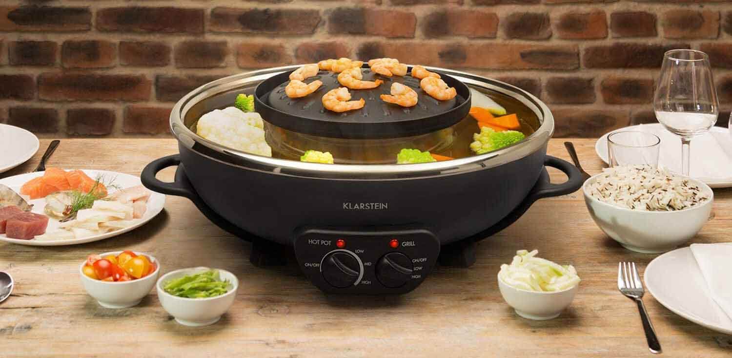 KLARSTEIN Szechuan - Hot pot Chinois, Hot pot fusing, Grill de 22 cm de diamètre, Revêtement anti adhésif, 600 watts, Nettoyage rapide - Noir