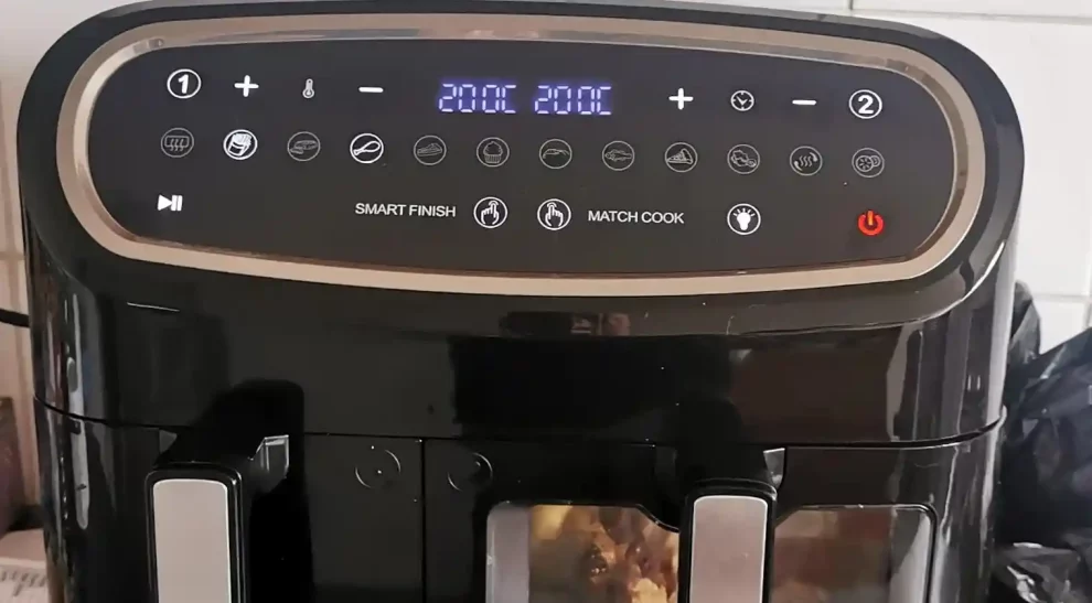 L’écran affiche en permanence la température et le temps restants pour chaque zone. Un bouton SMART FINISH juxtapose les deux cuissons pour qu’elles se terminent en même temps. Pratique quand je lance des frites (200 °C, 18 min) d’un côté et des nuggets maison (180 °C, 12 min) de l’autre.