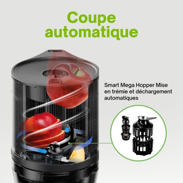 - Remarquablement intelligent et pratique : Les ingrédients peuvent être insérés entiers, non préparés. La coupe et l’extraction sont automatiques.