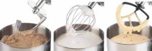 Les accessoires fournis sont plutôt de bonne facture, il faudra juste faire attention au système de fixation qui est parfois en plastique. J’ai regretté aussi l’absence de poignée sur le bol du robot. Hormis cela, j’ai tout particulièrement apprécié le batteur plat à bords souples qui permet de bien ramener la pâte au centre et de la décoller des bords de la cuve.