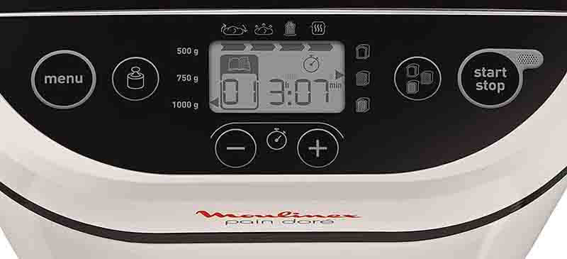 J’ai trouvé le panneau de commandes intuitif sur la machine à pain Moulinex Pain Doré. Cela simplifie le processus de préparation. L’écran LCD (qui n’est pas rétro-éclairé) affiche assez clairement les paramètres sélectionnés et l’heure, facilitant ainsi la surveillance et le contrôle. Par contre, il est dommage que la machine ne soit pas doté d’un hublot pour surveiller encore mieux le processus de fabrication et de cuisson du pain. J’ai également regretté que la Pain Doré ne dispose pas d’un distributeur automatique d’ingrédients.