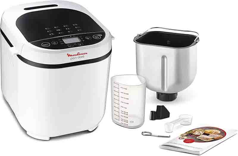La Moulinex Pain Doré est livrée avec une gamme d’accessoires utiles, notamment une cuillère doseuse pour mesurer précisément les ingrédients, un verre doseur et un crochet à pain pour faciliter la manipulation de la pâte. Bien sûr on retrouve aussi la cuve de l’appareil. Enfin, chose appréciable, l’appareil est livré avec un livre de recettes.