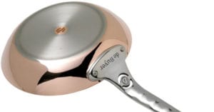 Nous avons là une poêle à frire en 90 % de cuivre et 10 % d’inox. Le meilleur des deux mondes dans une seule poêle à frire. La conductibilité de la chaleur est parfaite et le fond en inox permet un entretien aisé.