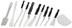 Cette spatule, aussi appelée palette, sert à étaler et lisser des crèmes. Elle est composée d’une partie métallique souple et plate ainsi que d’un manche en plastique. Elle doit avoir plusieurs qualités : elle doit être suffisamment flexible pour sa maniabilité mais aussi très robuste pour pouvoir se tordre sans céder. On la préfère en acier inoxydable pour durer dans le temps.