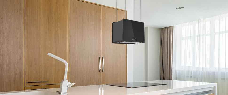 • Notre hotte d'île suspendue silencieuse et puissante est idéale pour aspirer efficacement les fumées, la graisse, l'humidité et même la chaleur de votre cuisine