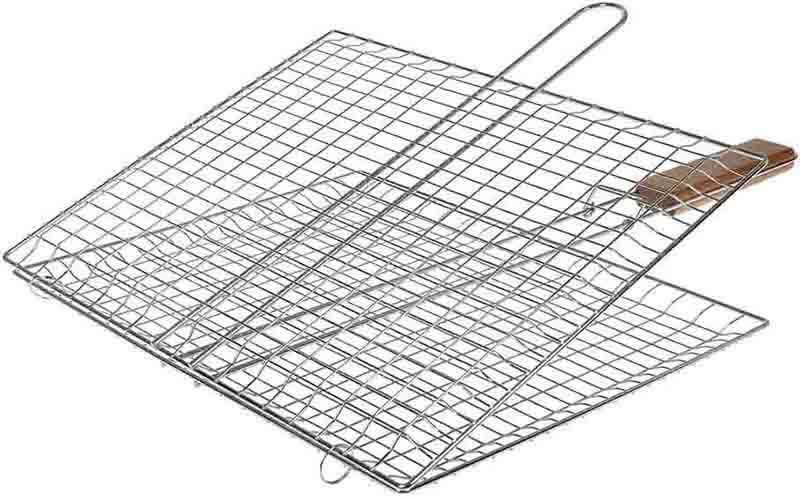 • Grilles de cuisson barbecue et fumoir - Grille de barbecue double, grille barbecue rectangulaire, grille BBQ 42x34 avec poignée en bois d'Acacia - Panier grille barbecue