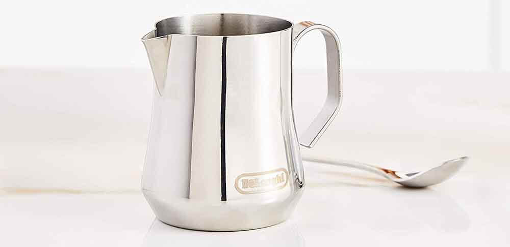 Je commence ma sélection avec le pichet à lait DeLonghi. En effet, ce pichet à lait inox est certainement un des meilleurs du marché. Avec son bec verseur pratique, vous pourrez réaliser des motifs précis à la surface de votre boisson. Il permet même de bien contrôler le flux. Par ailleurs, il m’a particulièrement plu grâce à sa praticité. En effet, ce pichet à lait possède une capacité de 400 ml. Il est parfait pour préparer une tasse de boisson lactée sans gaspiller de lait. Enfin, sachez qu’il passe au lave-vaisselle après son utilisation.