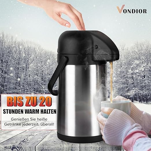 - La verseuse à café isolée à double paroi Vondior, qui utilise une technologie d’isolation sous vide testée en laboratoire, garantit que les boissons chaudes restent au chaud jusqu’à 20 heures et que les boissons froides restent fraîches jusqu’à 24 heures.