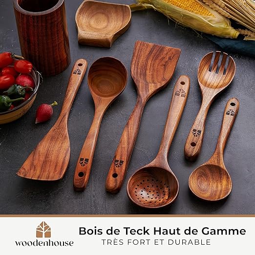 - Élégants & Durables : Nos ustensiles de cuisine en bois sont fabriqués dans une seule pièce de bois de teck 100% naturel. Chaque spatule est protégée contre les fissures par une laque naturelle.