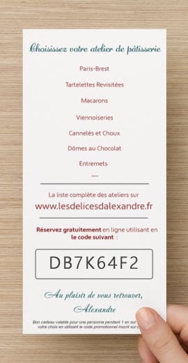 Les anciens modèles de bons cadeaux (avant décembre 2018) ne possèdent pas de codes au dos. Pour réserver il suffit simplement de me contacter à contact@lesdelicesdalexandre.fr en me précisant l’atelier de votre choix, le nom et prénom de la personne qui participe, son numéro de téléphone ainsi qu’une adresse mail. Pensez également à apporter votre bon cadeau le jour de l’atelier pour bénéficier de la gratuité du cours.